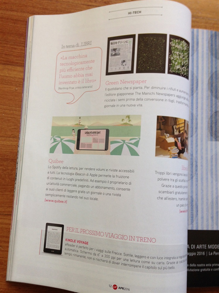 Lo Spotify della lettura, per rendere volumi e riviste accessibili a tutti. La tecnologia iBeacon di Apple permette la fruizione di contenuti in luoghi predefiniti. Ad esempio il proprietario di un'attività commerciale, pagando un abbonamento, consente ai suoi clienti di leggere gratis un giornale o una rivista semplicemente restando nel suo locale.
