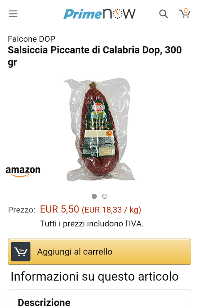 A partire da oggi Prime Now apre infatti la categoria “Specialità calabresi” che raccoglie le eccellenza alimentari di questa regione. La categoria Specialità calabresi permette di ricevere in un'ora o in una finestra di due ore prodotti freschi come la soppressata dolce e piccante DOP, la tradizionale nduja calabrese, la composta alla cipolla rossa di Tropea o la confettura ai fichi. E ancora filetti di tonno e sgombro al naturale o all'olio extravergine biologico, lingue di grano calabresi, pomodori secchi, taralli e frese, ma anche dolci tipici, come il tartufo di Pizzo e liquori.