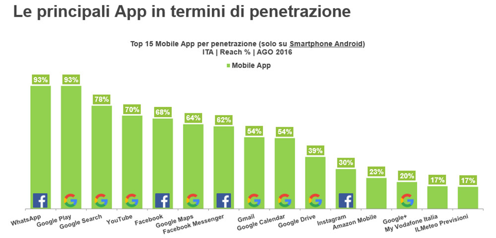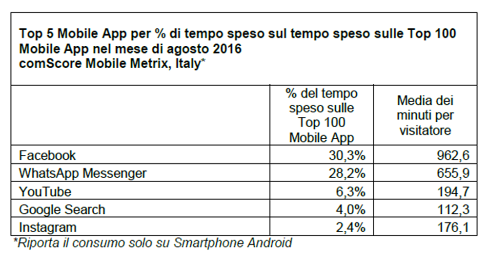 Ad ogni modo, nel mese di agosto 2016 il tempo spento in-app sulle top 100 property è risultato 8 volte superiore a quello speso in mobile browsing, evidenziando che le app sono la modalità preferita dai visitatori più coinvolti e fedeli per interagire con contenuti e servizi. Facebook e WhatsApp sono al primo e secondo posto in termini di coinvolgimento detenendo rispettivamente il 30,3% e il 28,2% del tempo speso sulle prime 100 mobile app durante il mese di agosto 2016.