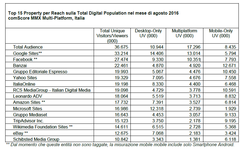 - La Total Digital Population ha raggiunto in Italia i 36,6 milioni di visitatori ad agosto 2016 sui quali le 7 maggiori properties vantano una reach superiore al 50%;