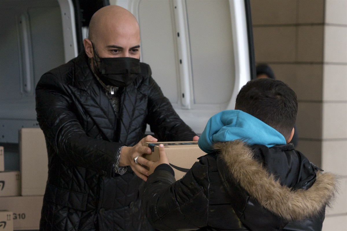 Giuliano Sangiorgi dei negramaro consegna prodotti donati a Save the Children da Amazon.it per sostenere la campagna Riscriviamo il Futuro