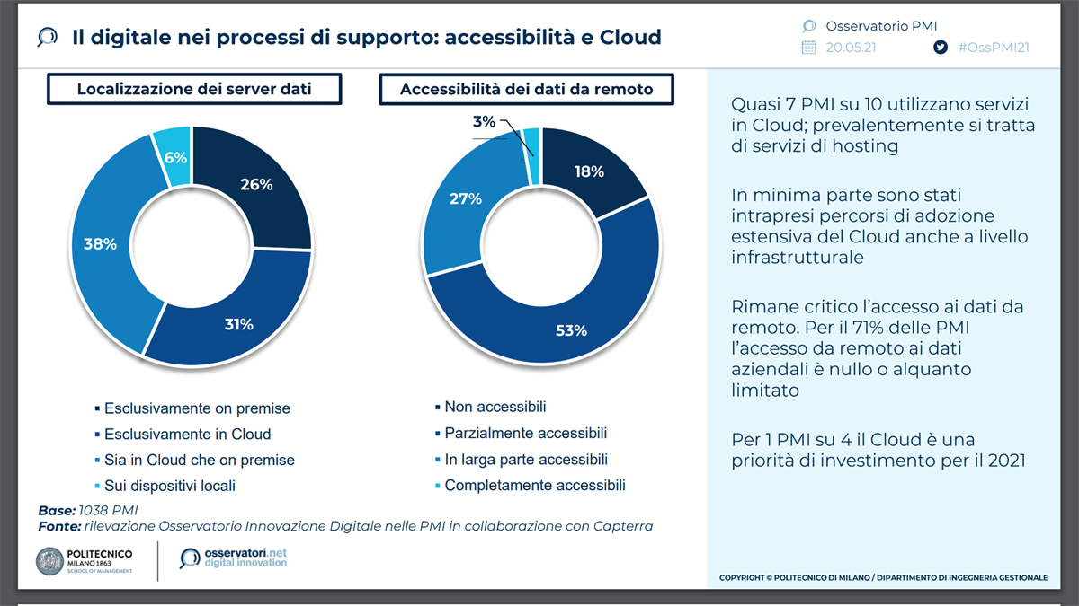 Il ricorso al lavoro da remoto, le pratiche di rotazione dei turni dei dipendenti e le esigenze di distanziamento sociale hanno portato ad un incremento di adozione di soluzioni digitali per lo scambio di dati e informazioni aziendali. Da un lato 9 PMI su 10 gestiscono in maniera elettronica almeno una parte dei propri documenti aziendali, quali documenti di trasporto o conferme d'ordine. Dall'altro, si è registrato un forte aumento dei servizi in Cloud, fruiti dal 69% delle PMI, dovuto principalmente ad un maggiore utilizzo dei servizi software di base, e in minor parte a investimenti infrastrutturali in Cloud.