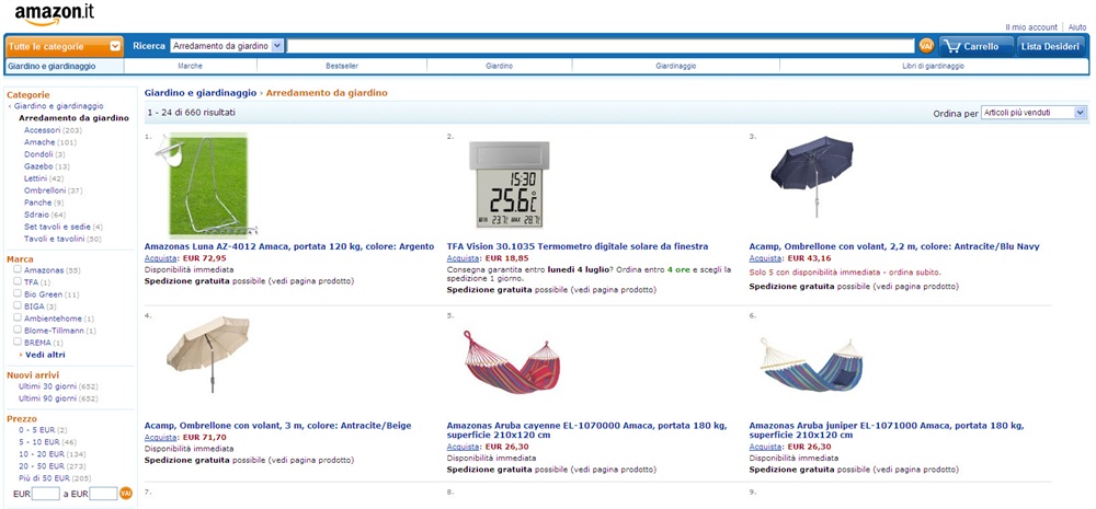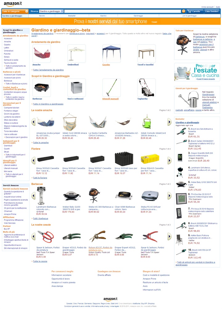 Lussemburgo, 1 Luglio 2011 – Amazon.it aumenta l’assortimento di prodotti e lancia oggi una nuova categoria: “ Giardino e giardinaggio”. Novità anche nella categoria Cucina, che si arricchisce di numerosi articoli di casalinghi. In questo modo, Amazon offre ai clienti italiani una scelta sempre più ampia e aumenta costantemente il numero di prodotti disponibili.