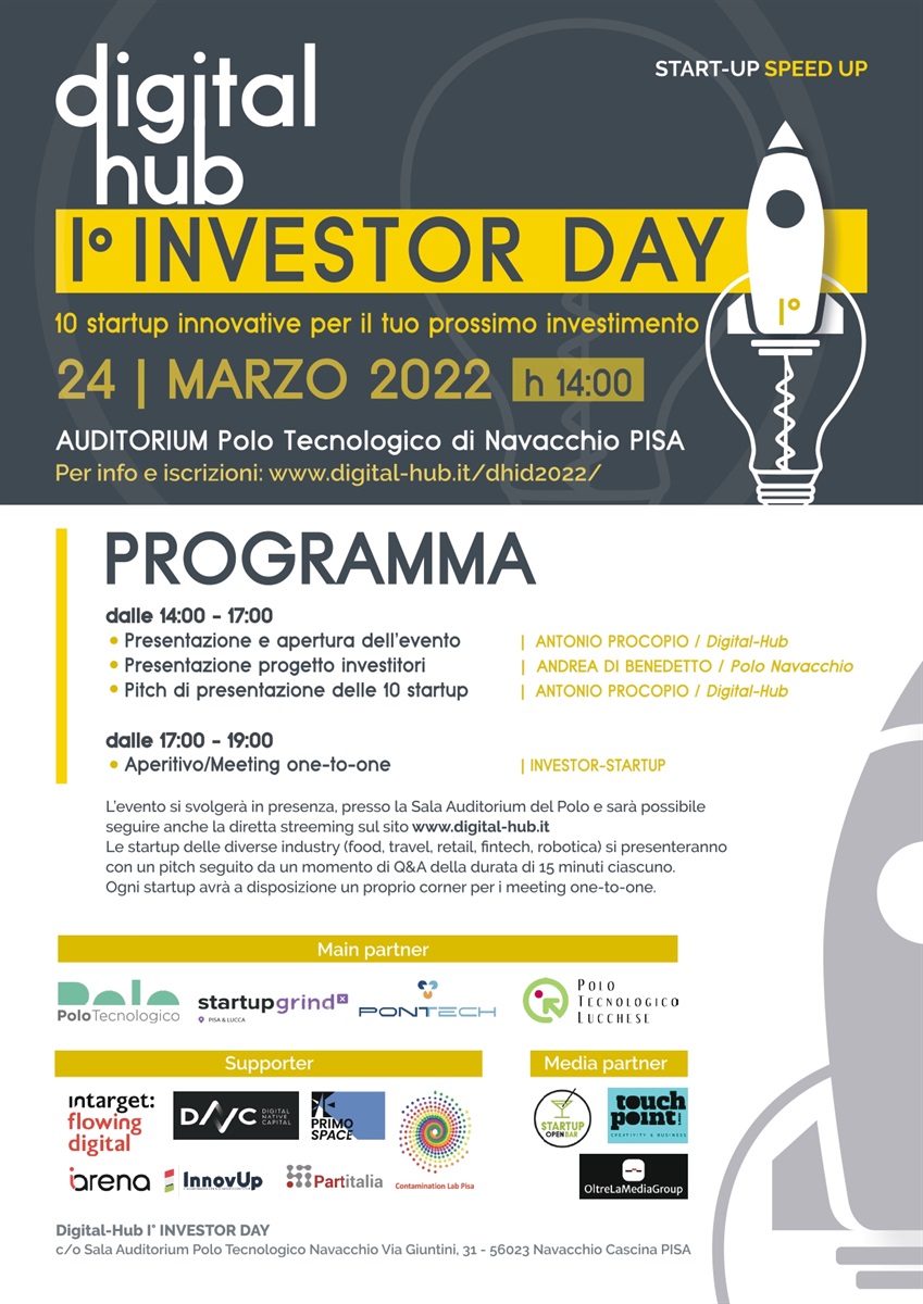 L’evento si terrà in presenza e online giovedì 24 Marzo, presso l’Auditorium del Polo Tecnologico di Navacchio ed è rivolto ad aziende, professionisti e fondi di investimento interessati a conoscere le startup. È possibile registrarsi gratuitamente sia per l’evento fisico che online a questo link.