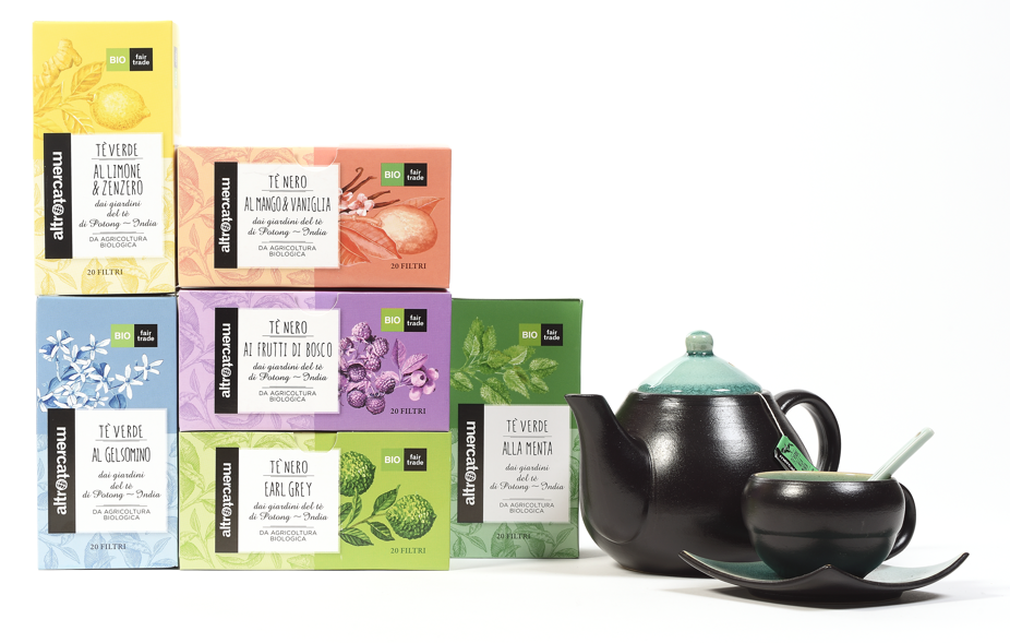 La linea di tè darjeeling è una linea di tè bio coltivati nei giardini del Darjeeling, alle pendici dell’Himalaya, tra i 1.000 e i 2.000 metri di altitudine in una delle zone più rinomate al mondo per la coltivazione di questa pianta. Le foglie e i germogli di tè vengono raccolti manualmente e confezionati in astucci che contengono bustine incartate singolarmente. Comprende principalmente due tipologie il tè nero e quello verde. Viene realizzata dall’organizzazione di produttori  Ambootia, in India, che fonda la propria missione sui princìpi di sostenibilità ambientale, sociale ed economica ed è pioniere dell’agricoltura biologica e biodinamica fin dal 1994. I profitti generati dal Commercio Equo vengono investiti su progetti ambientali, di sostegno alla comunità e in infrastrutture per la collettività e per i lavoratori.