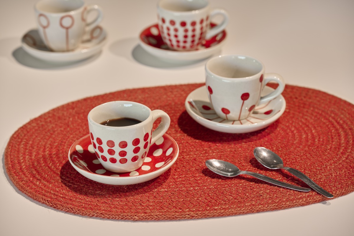 Dalle tazzine da caffè con piattino decorato con pallini rossi, al Kit tazza e teiera single di ceramica, disponibile di colore rosso prodotte in India. Mentre dal Vietnam si possono scegliere i Mug con decori rossi in ceramica o i posa cucchiaio sempre con decori rossi in ceramica.