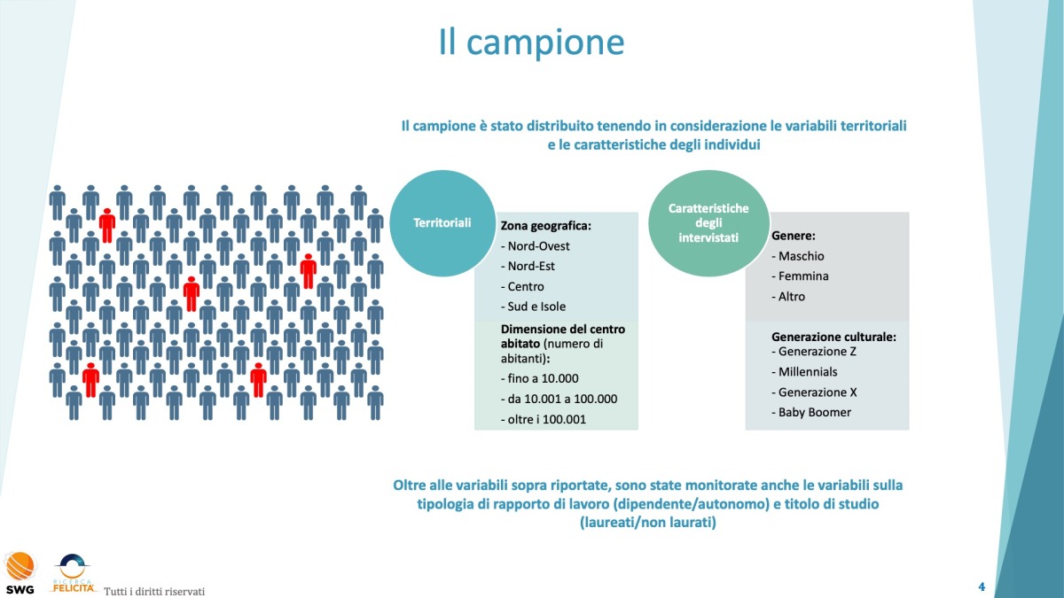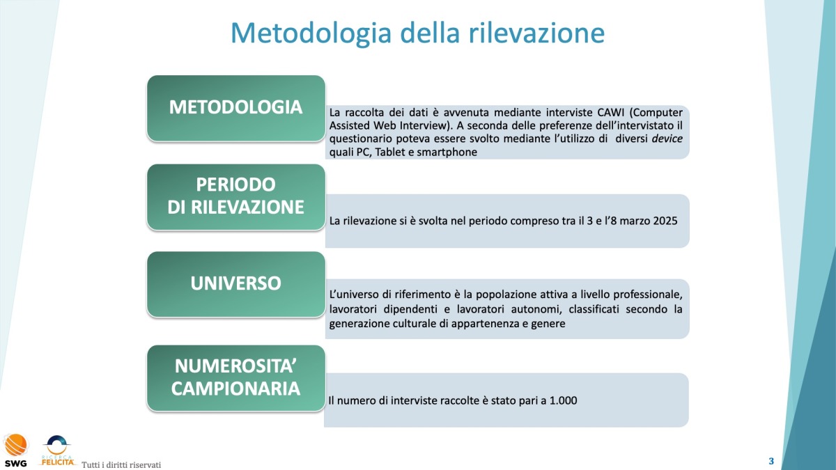Associazione Ricerca Felicità: nasce dall’incontro tra Sandro Formica, Elga Corricelli ed Elisabetta Dallavalle e mira a voler comprendere lo stato attuale di felicità e benessere nel nostro Paese attraverso un’indagine annuale. L’Osservatorio BenEssere Felicità è uno strumento nato con l’obiettivo di misurare la felicità tra la popolazione professionalmente attiva, alla sua quinta edizione oltre a riconfermare alcuni argomenti passati utili a creare trend e a permettere un’analisi longitudinale di alcuni fenomeni, nel 2025 ha inserito degli specifici focus tra cui Felicità e welfare grazie alla partnership tecnica con Up.