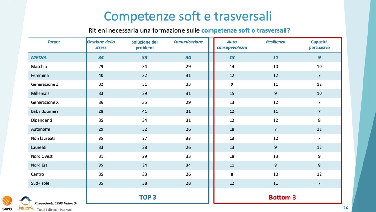 Il Sud e le Isole guidano la classifica, anche se con minore scarto, nel considerare vere le seguenti affermazioni: “Nella mia azienda c’è un approccio positivo nel fare/ gestire le cose”; “Nella mia azienda creatività e innovazione sono supportate/ apprezzate” e “Ho una carriera che valorizza i miei talenti e i miei punti di forza”.