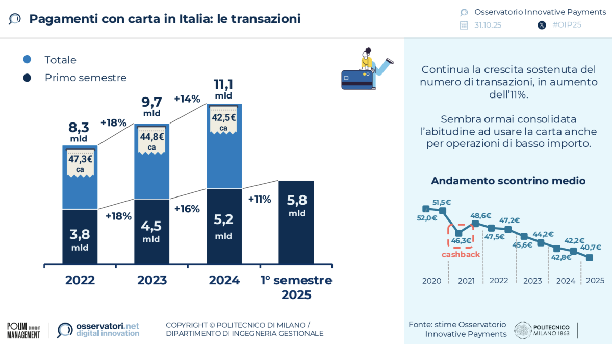 Nel primo semestre 2025 gli italiani hanno pagato con carta (in negozio od online)236 miliardi di euro, in crescita del +6% rispetto al primo semestre del 2024. Volano gli innovative payments in negozio (+46%).