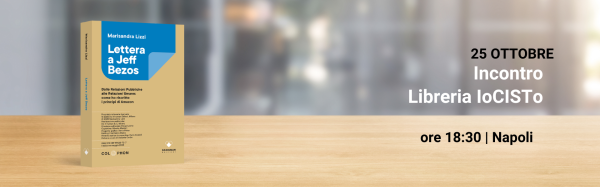 Sabato 25 ottobre, ore 16:00, IoCiSto – La Libreria di Tutti (Via Cimarosa 20, Vomero) Per dare a tutti la possibilità di partecipare e poi godersi con calma la partita Napoli-Inter, la prima presentazione napoletana del libro Lettera a Jeff Bezos di Marisandra Lizzi è stata anticipata alle ore 16:00. Un orario perfetto per incontrarsi, dialogare e r...